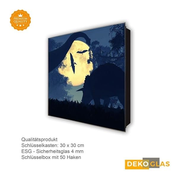 Schlüsselkasten 'Dinos im Mondschein' 30×30 Glas, inkl. Haken Schlüsselbrett Schlüssel-Box Design Aufbewahrung
