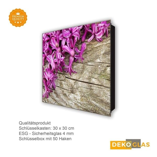 Schlüsselkasten 'Hyazinthen auf Holz' 30×30 Glas, inkl. Haken Schlüsselbrett Schlüssel-Box Design Aufbewahrung