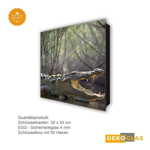 Schlüsselkasten 'Krokodil am Fluss' 30×30 Glas, inkl. Haken Schlüsselbrett Schlüssel-Box Design Aufbewahrung