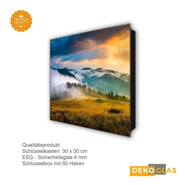 Mit diesem hochwertigen ca. 30 x 30 cm großen Schlüsselkasten dekorieren Sie gekonnt Ihren Eingangsbereich und sind nie wieder auf der Suche nach Ihren Schlüsseln. Der Schlüsselkasten von Glasbilder-Welt wird im Digitaldruck hergestellt, mit höchster Auflösung auf Folie gedruckt und anschließend auf Sicherheitsglas (ESG) geklebt. Durch das hoch entwickelte Produktionsverfahren, sowie die Verwendung neuester Nanotechnologie wird eine besondere 3D-Tiefenwirkung und Farbintensität erzielt.