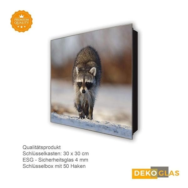 Schlüsselkasten 'Laufender Waschbär' 30×30 Glas, inkl. Haken Schlüsselbrett Schlüssel-Box Design Aufbewahrung