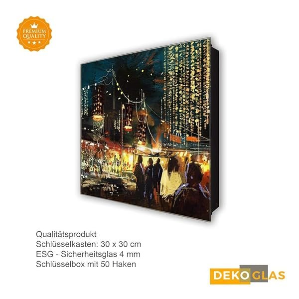 Mit diesem hochwertigen ca. 30 x 30 cm großen Schlüsselkasten dekorieren Sie gekonnt Ihren Eingangsbereich und sind nie wieder auf der Suche nach Ihren Schlüsseln. Der Schlüsselkasten von Glasbilder-Welt wird im Digitaldruck hergestellt, mit höchster Auflösung auf Folie gedruckt und anschließend auf Sicherheitsglas (ESG) geklebt. Durch das hoch entwickelte Produktionsverfahren, sowie die Verwendung neuester Nanotechnologie wird eine besondere 3D-Tiefenwirkung und Farbintensität erzielt.