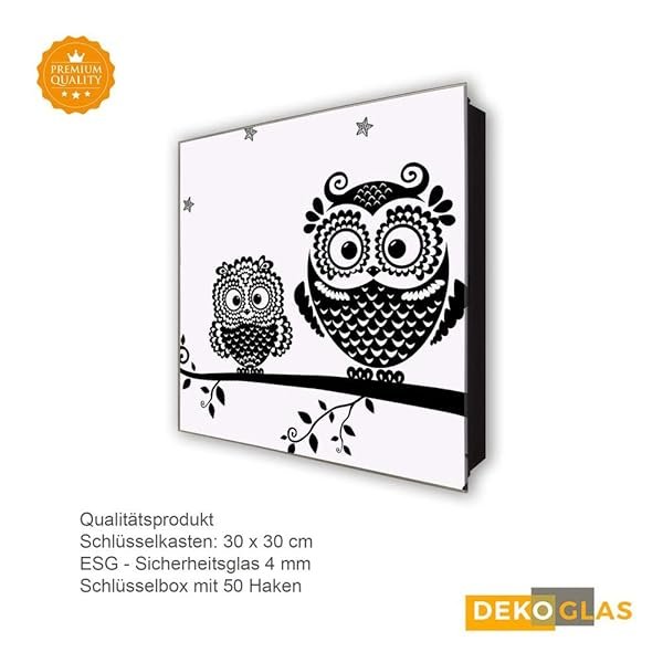 Schlüsselkasten 'Owl Black&White' 30×30 Glas, inkl. Haken Schlüsselbrett Schlüssel-Box Design Aufbewahrung