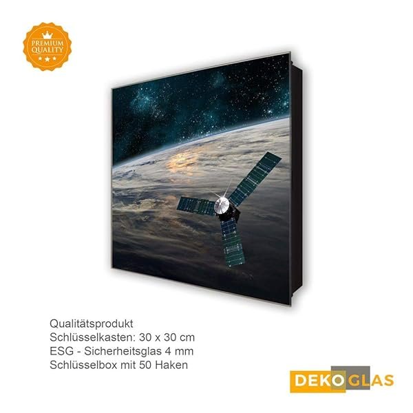 Schlüsselkasten 'Satellit im All' 30×30 Glas, inkl. Haken Schlüsselbrett Schlüssel-Box Design Aufbewahrung