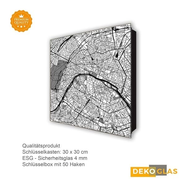 Schlüsselkasten 'Stadtplan' 30×30 Glas, inkl. Haken Schlüsselbrett Schlüssel-Box Design Aufbewahrung