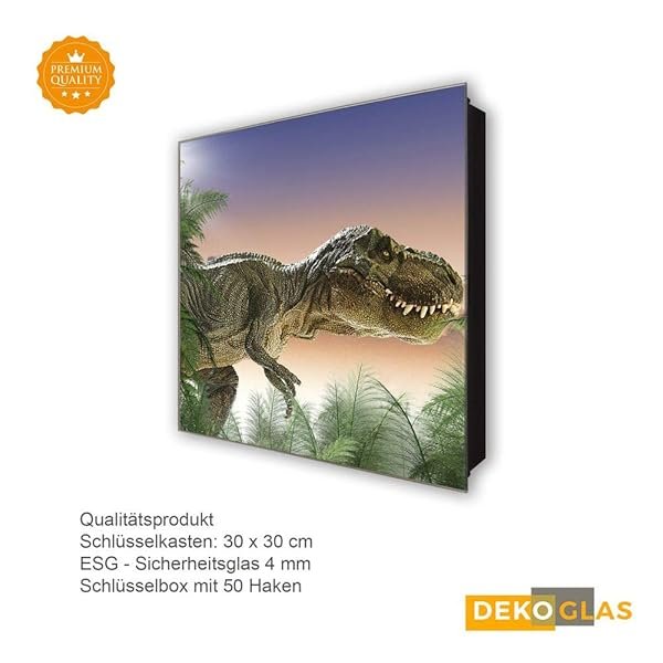 Schlüsselkasten 'T-rex auf Jagd' 30×30 Glas, inkl. Haken Schlüsselbrett Schlüssel-Box Design Aufbewahrung