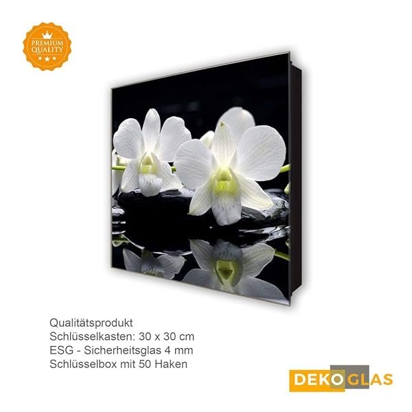 Schlüsselkasten 'Weiße Orchideen' 30×30 Glas, inkl. Haken Schlüsselbrett Schlüssel-Box Design Aufbewahrung